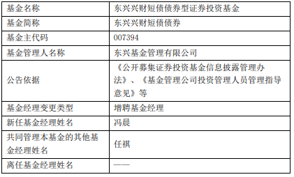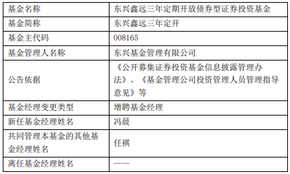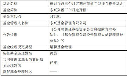 东兴基金旗下3只债基增聘冯晨