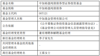 中国经济网北京7月15日讯 近日,中加基金公告,中加裕盈纯债债券增聘李子家,王霈离任。