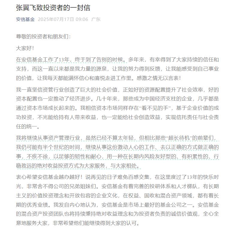 “安信基金”微信公众号同步发出了《张翼飞致投资者的一封信》,宣布了其离开公司的消息。张翼飞在文中称,在安信基金度过了13年的快乐时光,舍不得公司的兄弟姐妹们,但也终于到了告别的时候。他说,多年来,有幸得到了大家持续的信任和支持,这一直以来是其力量的源泉。
