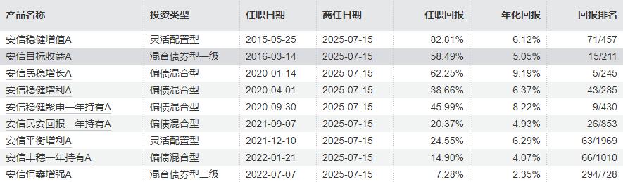 此外,他管理安信民稳增长A的任职回报为62.25%,年化回报为9.19%;管理安信稳健聚申一年持有A的任职回报为45.99%,年化回报为8.22%。