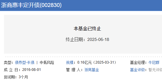 根据中国经济网记者了解,浙商惠丰定开债在2016年8月1日成立时的规模为5亿元,截至2025年6月17日(基金最后运作日),基金份额总额7,170,299.24份,基金份额净值1.0637元。而天天基金网数据显示,其在今年6月17日的累计单位净值为1.3267元。