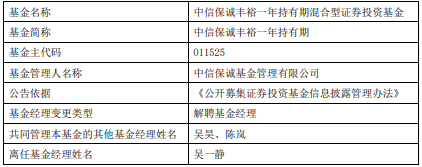 中国经济网北京7月18日讯 昨日,中信保诚基金公告,吴一静离任中信保诚丰裕一年持有期。