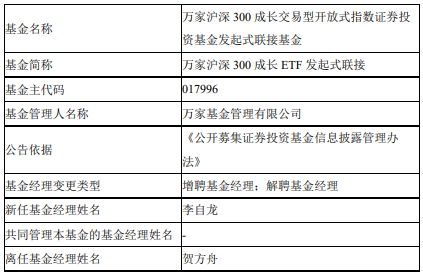 中国经济网北京7月23日讯 今日,万家基金公告,万家沪深300成长ETF发起式联接增聘李自龙,贺方舟离任。