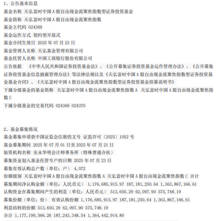 中国经济网北京7月24日讯 今日,天弘基金发布天弘富时中国A股自由现金流聚焦指数型证券投资基金基金合同生效公告。