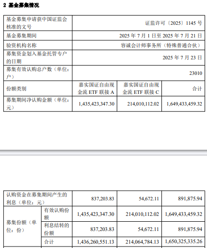 嘉实国证自由现金流ETF联接成立 规模16.5亿元