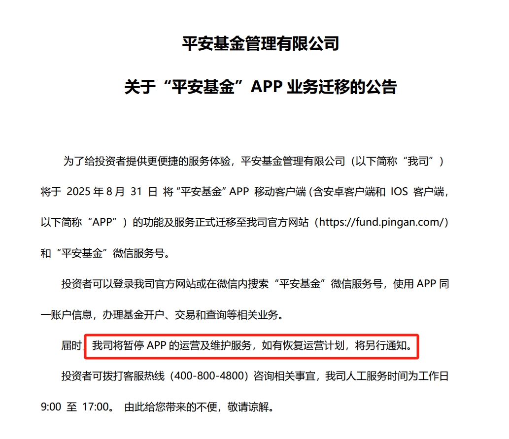 近日,平安基金发布“APP业务迁移的公告”,称将在今年8月31日将“平安基金”APP的功能和服务迁移至官网和“平安基金”微信服务号。届时,APP将暂停运营和维护,如有恢复运营计划,将另行通知。