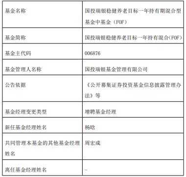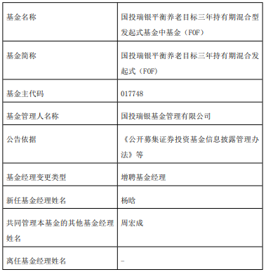 国投瑞银基金旗下两只FOF基金增聘杨晗