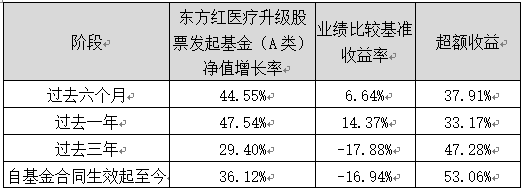 注2:东方红医疗升级股票发起基金(A类)成立于2022.3.29,2022.3.29至2022.12.31、2023年、2024年净值增长率为1.48%、2.66%和-9.61%,同期业绩比较基准收益率分别为-3.68%、-10.16%和-9.99%。业绩比较基准为:中证全指医药卫生指数收益率×70%+恒生医疗保健指数收益率(经汇率估值调整)×10%+中国债券总指数收益率×20%。 基金经理:江琦(2022.3.29起至今)
