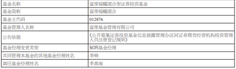 中国经济网北京8月12日讯 今日,富荣基金公告,李黄海离任富荣福耀混合。