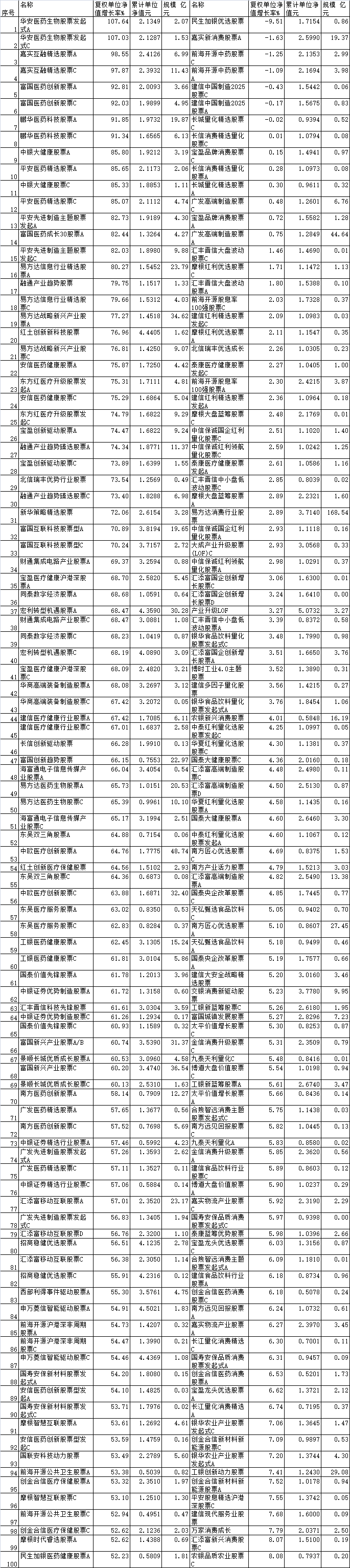其余涨幅靠前的还有中银大健康股票A、平安医药精选股票A、中银大健康股票C、平安医药精选股票C、平安先进制造主题股票发起A、富国医药成长30股票A、平安先进制造主题股票发起C、易方达信息行业精选股票A等,多数都为医药主题基金,涨幅也都在80%以上。