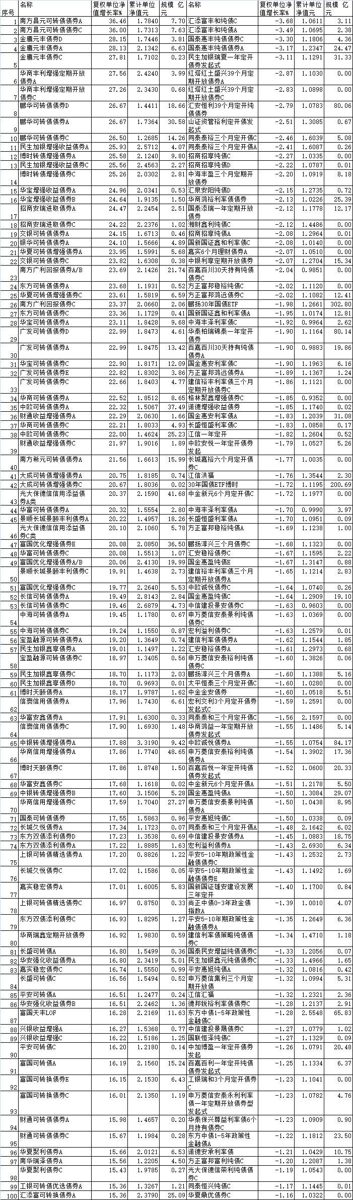 其余跌幅靠前的债基还有红塔红土盛兴39个月定期开放债券A、红塔红土盛兴39个月定期开放债券C、汇安恒利39个月定开纯债债券、山证资管裕利定开债发起式、同泰泰裕三个月定开债C、同泰泰裕三个月定开债A等。