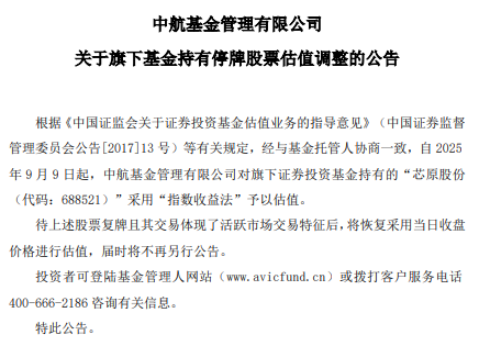 公告称,经与基金托管人协商一致,自2025年9月9日起,中航基金管理有限公司对旗下证券投资基金持有的“芯原股份(代码:688521)”采用“指数收益法”予以估值。