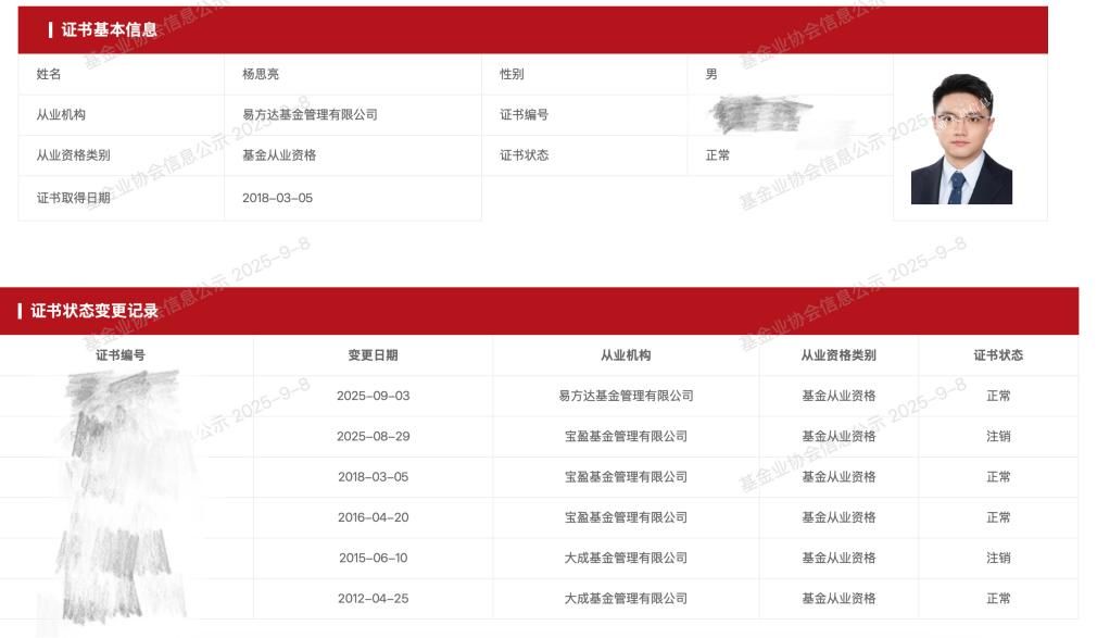 中基协近期更新的从业人员备案信息显示,杨思亮的任职机构已变更为易方达基金,对此,公募圈似乎并未感到意外。这位前宝盈基金知名基金经理在8月密集卸任了宝盈优势产业混合、宝盈价值成长等5只产品的基金经理职务,离职信号已然明确。