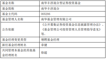 中国经济网北京9月12日讯 今日,南华基金公告,南华丰淳混合增聘章健。