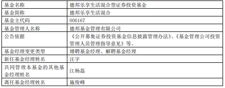 中国经济网北京9月15日讯 近日,德邦基金公告,德邦乐享生活混合增聘汪宇,施俊峰离任。