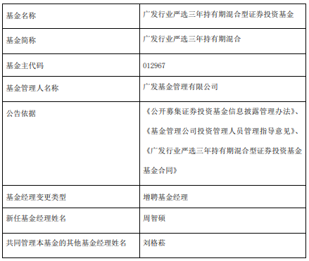 中国经济网北京9月15日讯 近日,广发基金公告,广发行业严选三年持有期混合增聘周智硕,与刘格菘共同管理该基金。