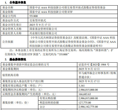国泰中证AAA科技创新公司债ETF成立 规模29.86亿元