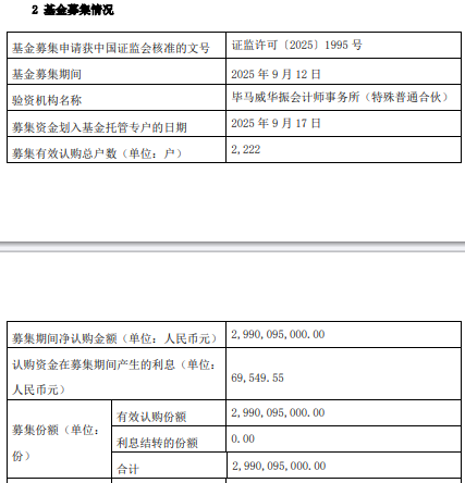 募集期间净认购金额2,990,095,000.00元,认购资金在募集期间产生的利息69,549.55元,募集份额合计2,990,095,000.00份。