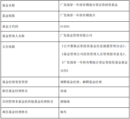 广发瑞誉一年持有期混合增聘孙迪 杨冬离任