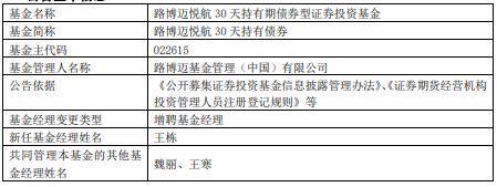 中国经济网北京9月18日讯 今日,路博迈基金公告,路博迈悦航30天持有债券增聘王栋。