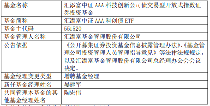 中国经济网北京9月19日讯 今日,汇添富基金公告,汇添富中证AAA科创债ETF增聘晏建军。