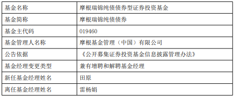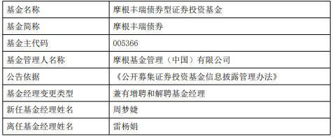 中国经济网北京9月19日讯 今日,摩根基金公告,雷杨娟离任摩根瑞锦纯债债券、摩根瑞盛87个月定期开放债券、摩根纯债丰利债券、摩根丰瑞债券。