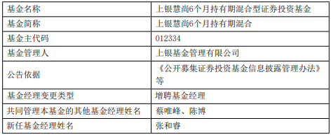 中国经济网北京9月19日讯 今日,上银基金公告,上银慧尚6个月持有期混合增聘张和睿。