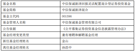 中国经济网北京9月23日讯 今日,中信保诚基金公告,中信保诚新泽混合、中信保诚新悦混合增聘金山,孙浩中离任。