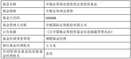 中国经济网北京9月24日讯 今日,中银国际证券公告,中银证券鸿安债券增聘王玉玺。
