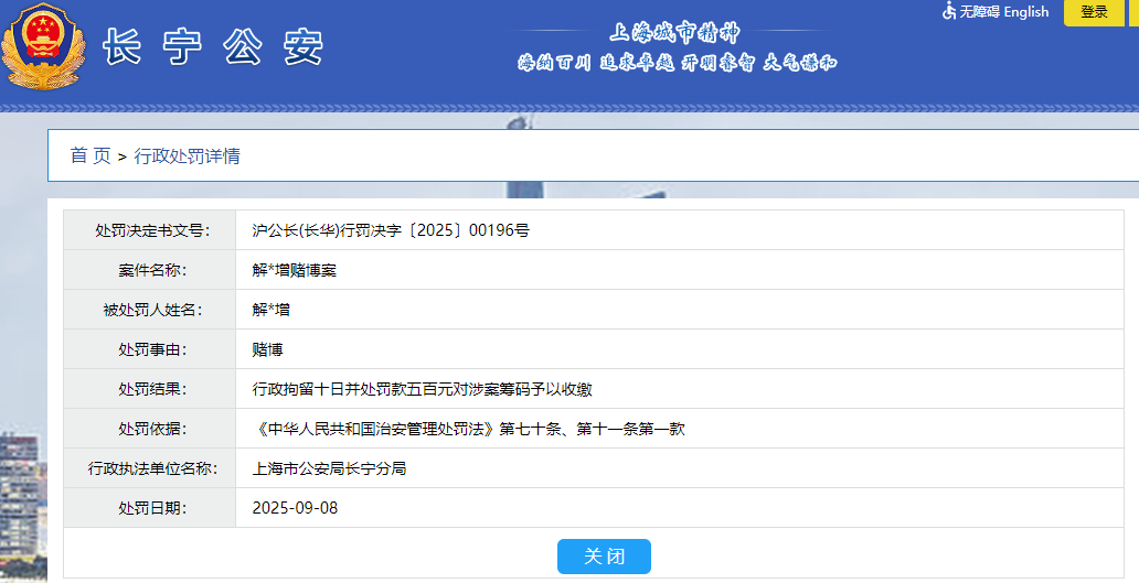 9月8日,上海市公安局长宁分局公布的行政处罚决定书显示,解某增因赌博被行政拘留十日并处罚款五百元,对涉案筹码予以收缴。