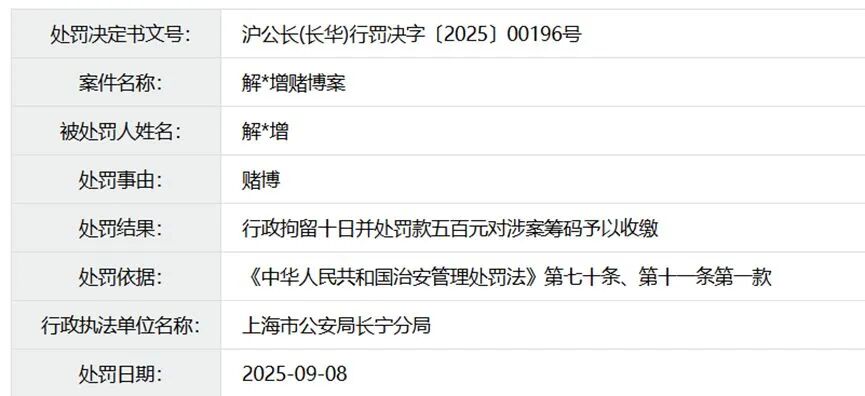 近日,长宁公安官网披露了一则行政处罚决定书,其中提及被处罚人“解*增”因赌博被行政拘留并罚款,而该名字与西部利得基金的基金经理解文增非常相似。市场也纷纷热议,是否为同一个人。
