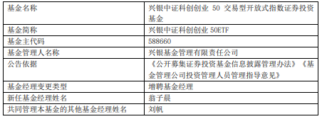 中国经济网北京9月26日讯 今日,兴银基金公告,兴银中证科创创业50ETF增聘翁子晨。