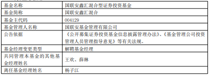 杨子江离任国联安基金旗下3只基金