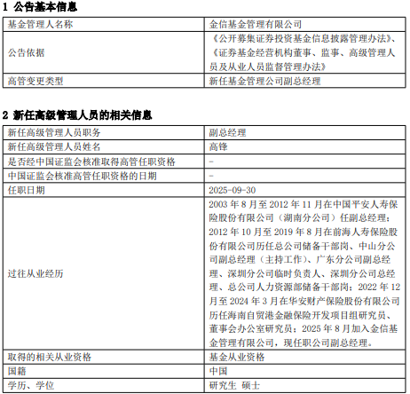 中国经济网北京10月9日讯 近日,金信基金公告,任命高锋为副总经理。