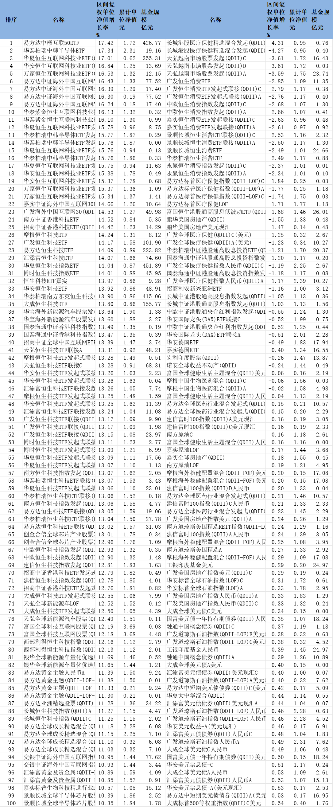 此外,华泰柏瑞中韩半导体ETF、华安恒生互联网科技业ETF(QDII)、万家恒生互联网科技业ETF(QDII)、易方达中证海外中国互联网50ETF联接(QDII)A(人民币份额)、易方达中证海外中国互联网50ETF联接(QDII)C(人民币份额)、易方达中证海外中国互联网50ETF联接(QDII)A(美元现汇份额)、易方达中证海外中国互联网50ETF联接(QDII)C(美元现汇份额)截至二季度末规模也在10亿元以上,这些基金9月份涨幅分别为17.34%、16.84%、16.53%、16.43%、16.39%、16.30%、16.24%。