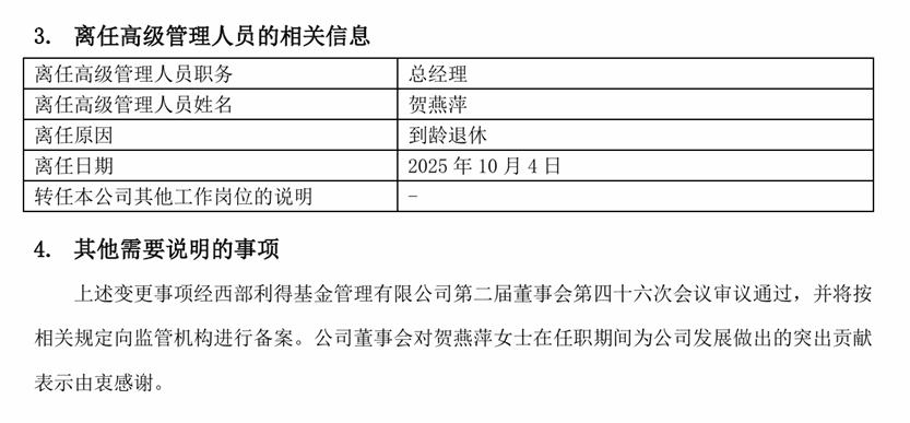 10月10日,西部利得基金发布高级管理变更公告,总经理贺燕萍到龄退休,离任日期2025年10月4日。由董事长何方代任总经理职位,公司对贺燕萍女士在任职期间为公司发展做出的突出贡献表示由衷感谢。
