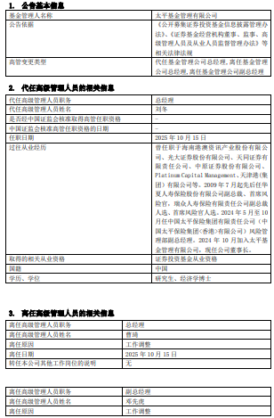 中国经济网北京10月16日讯 今日,太平基金公告,董事长刘冬代任总经理,原总经理曹琦因工作调整离任,副总经理邓先虎因工作调整离任。