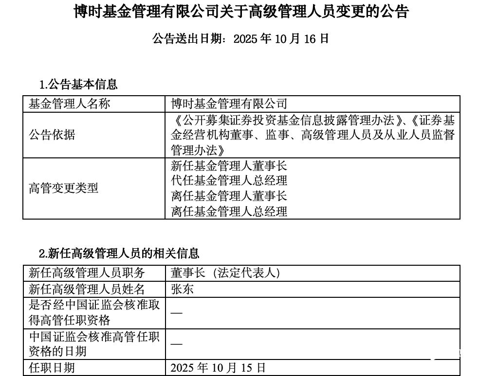 10月15日晚,博时基金发布高级管理人员变更公告称,公司董事长江向阳因工作安排辞任,博时基金党委书记、总经理张东正式接任公司董事长,同时自10月15日代为履行公司总经理职务。