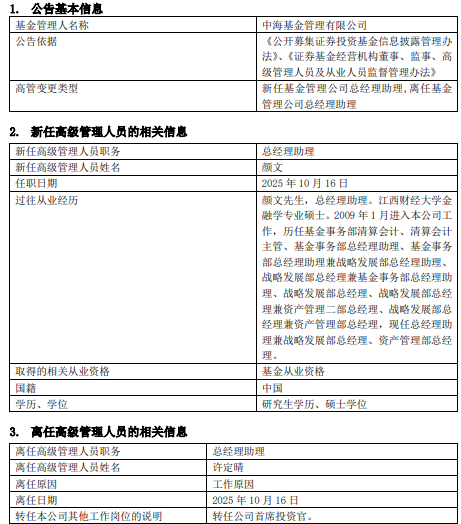 中海基金原总经理助理许定晴转任首席投资官