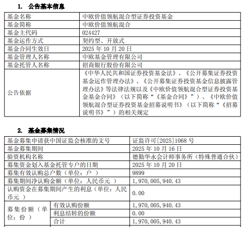 中欧价值领航混合成立 规模19.7亿元基金经理为蓝小康