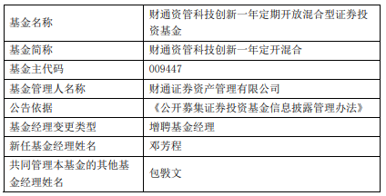 中国经济网北京10月21日讯 今日,财通证券资产管理有限公司公告,财通资管科技创新一年定开混合增聘邓芳程。