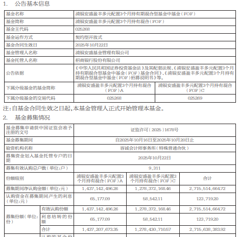 浦银安盛盈丰多元配置3个月混合FOF成立 规模27亿元