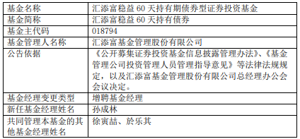 汇中国经济网北京10月27日讯 近日,汇添富基金公告,汇添富稳益60天持有债券、汇添富稳福60天滚动持有中短债、汇添富稳丰中短债债券、汇添富收益快线货币增聘孙成林。
