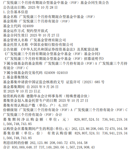 中国经济网北京10月28日讯 今日,广发基金发布广发悦康三个月持有期混合型基金中基金(FOF)基金合同生效公告。