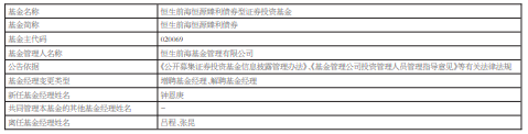 恒生前海恒源臻利债券增聘钟恩庚 吕程张昆离任