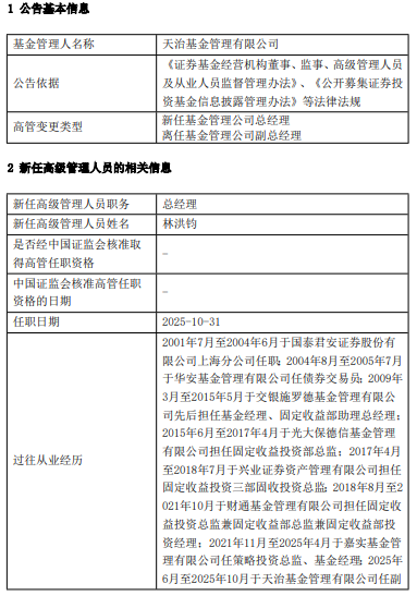 资料显示,林洪钧2001年7月至2004年6月于国泰君安证券股份有限公司上海分公司任职;2004年8月至2005年7月于华安基金管理有限公司任债券交易员;2009年3月至2015年5月于交银施罗德基金管理有限公司先后担任基金经理、固定收益部助理总经理;2015年6月至2017年4月于光大保德信基金管理有限公司担任固定收益投资部总监;2017年4月至2018年7月于兴业证券资产管理有限公司担任固定收益投资三部固收投资总监;2018年8月至2021年10月于财通基金管理有限公司担任固定收益投资总监兼固定收益部总监兼固定收益部投资经理;2021年11月至2025年4月于嘉实基金管理有限公司任策略投资总监、基金经理;2025年6月至2025年10月于天治基金管理有限公司任副总经理。