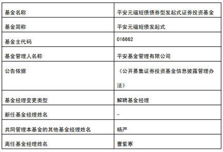 中国经济网北京11月3日讯 近日,平安基金公告,曹紫寒离任平安鑫惠90天持有债券、平安元福短债发起式。