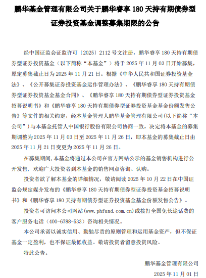 公告称,鹏华睿享180天持有期债券型证券投资基金将于2025年11月3日开始募集,原定募集截止日为2025年11月21日。现决定将该基金的募集期调整为2025年11月3日至2025年11月26日,即该基金的募集截止日由2025年11月21日变更为2025年11月26日。