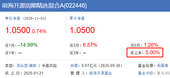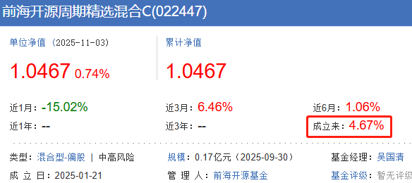 资料显示,前海开源周期精选混合自今年1月21日成立以来就一直由吴国清管理。吴国清历任南方基金管理股份有限公司研究员、基金经理助理、投资经理;2015年8月加盟前海开源基金管理有限公司,当年9月份开始管理公募基金,至今已有10年管理经验,现任前海开源执行投资总监、基金经理。