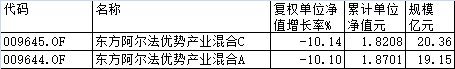 中国经济网北京11月4日讯 在刚过去的10月份里,东方阿尔法优势产业混合C、东方阿尔法优势产业混合A分别下跌10.14%和10.10%,成为该公司旗下10月份唯一一只跌超10%的基金。